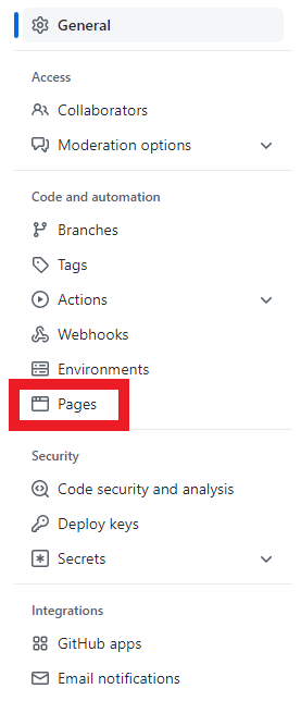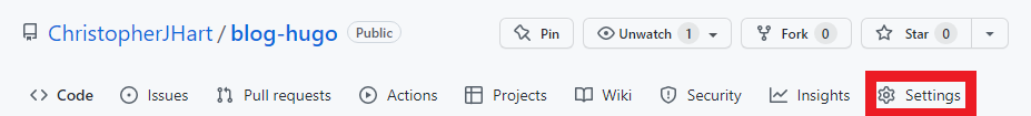 Next, we need to set up the GitHub Pages component of our blog. This will allow GitHub to automatically build and serve our website whenever changes are made to the underlying repository. First, left click on the “Settings” tab near the top of the repository. An example is below with the “Settings” button highlighted in red.