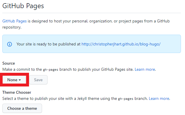By default, GitHub Pages will be disabled for this repository. To enable it, we need to select a branch for GitHub Pages to build and serve our website from. In the middle pane under the “Source” section, left click on the “None” dropdown menu. An example is below with the “None” dropdown menu highlighted in red.