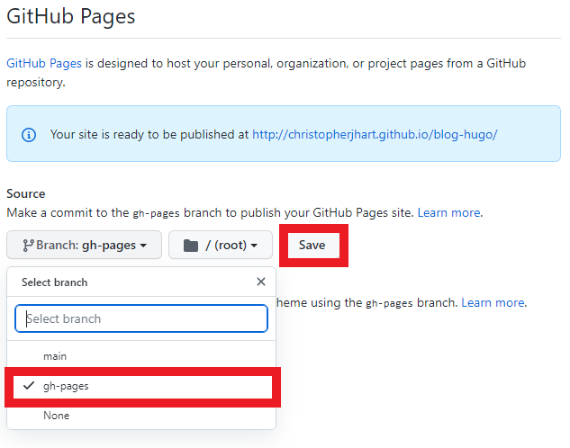 Left click on the “gh-pages” option from the dropdown menu that appears. This will allow GitHub Pages to build and serve our website based upon changes made in the gh-pages branch of our repository, which our GitHub Actions automatically pushes to. An example is below with the “gh-pages” option from the dropdown menu highlighted in red. Once you have modified this setting, left click on the “Save” button, also highlighted in red.