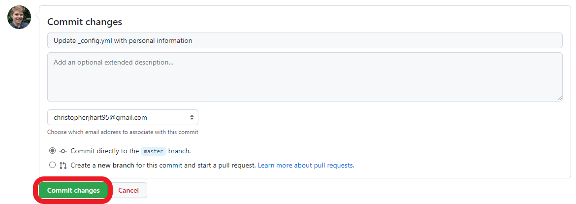 Once you have finished editing this file, you need to commit the changes. Scroll down to the bottom of the page and provide a brief description of the changes made to this file, such as “Update _config.yml with personal information”. Then, click the green “Commit changes” button. An example is below with the “Commit changes” button highlighted in red.
