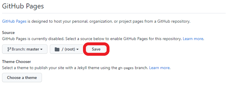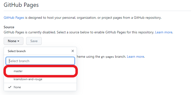 Left click on the “master” option from the dropdown menu that appears. This will allow GitHub Pages to build and serve our website based upon changes made in the master branch of our repository. An example is below with the “master” option from the dropdown menu highlighted in red.