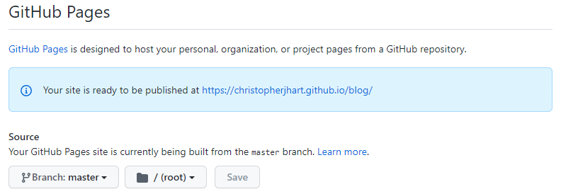 In a blue notification near the top of the middle pane, GitHub will state that our website is ready to be published at a specific URL.