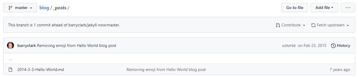 You will see a single file in this directory named 2014-3-3-Hello-World.md, which is a sample blog post included in the repository.