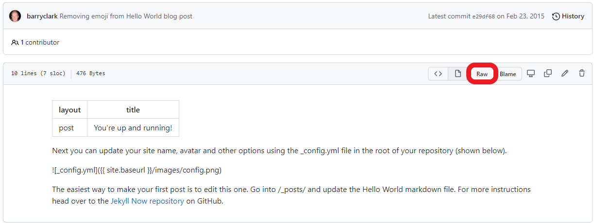 GitHub will display a rendered version of this file’s contents - however, to learn how to write a new blog post, we will want to see the raw contents of this file. Left click on the “Raw” button in the upper right corner of the middle pane to see the raw contents of this file. An example is below with the “Raw” button highlighted in red.