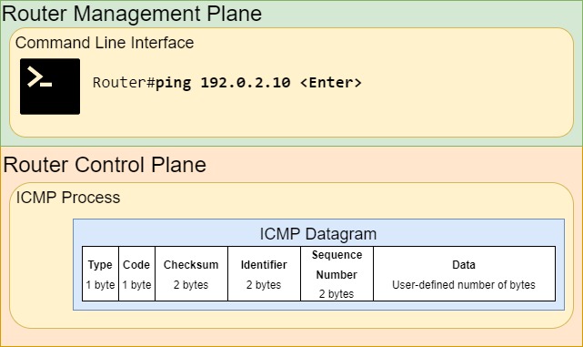 Let’s walk through precisely what happens when the ping 192.0.2.10 command is executed. First, the management plane sends a message through InterProcess Communication (IPC) to a software process of the network operating system responsible for handling the Internet Control Message Protocol (ICMP) for the device. We will refer to this software process as the “ICMP Process”. This IPC message informs the ICMP-related sofware process that the user would like to send ICMP Echo Request packets to a specific IPv4 address.