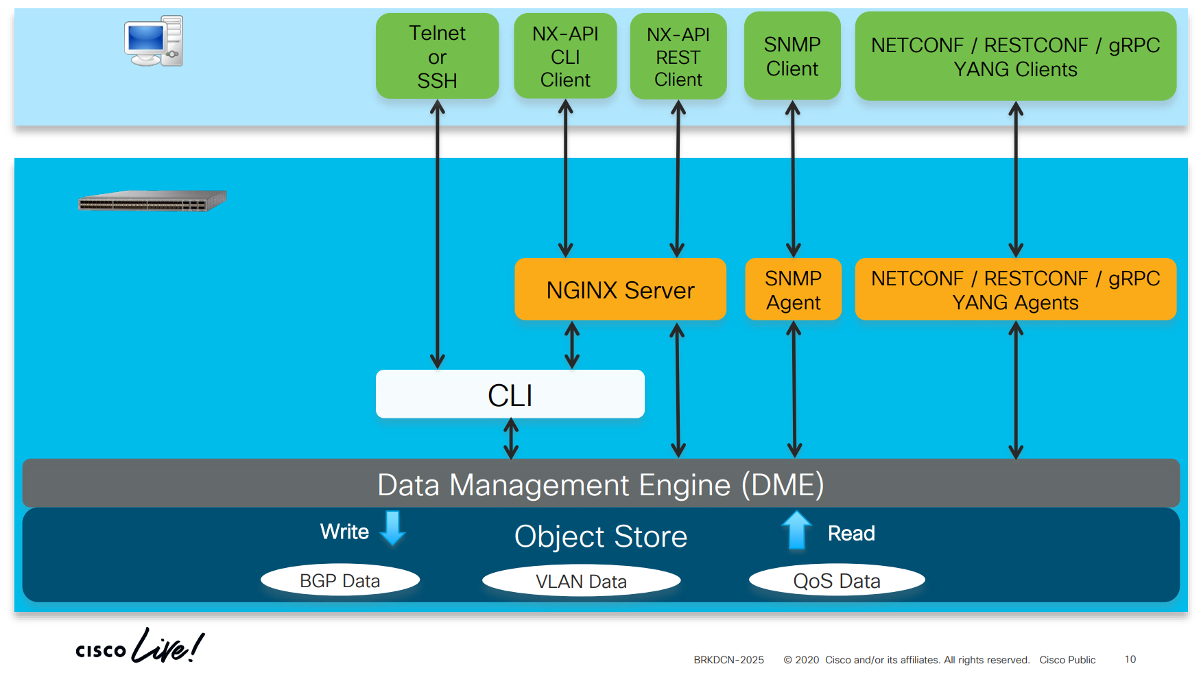 A visual example of how DME “sits” in between each software component’s object store (PSS), the CLI, and other various configuration methods is shown in the excerpt below from Mike Wiebe’s BRKDCN-2025 2020 Cisco Live session.