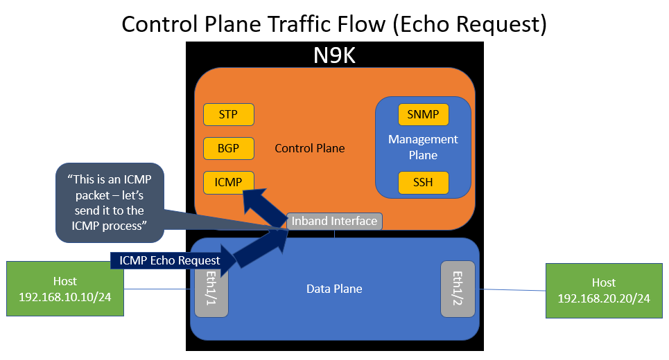 When the control plane receives this ICMP Echo Request packet through the inband interface, it will inspect it and “route” it to the ICMP software process so that the ICMP process can handle it accordingly.