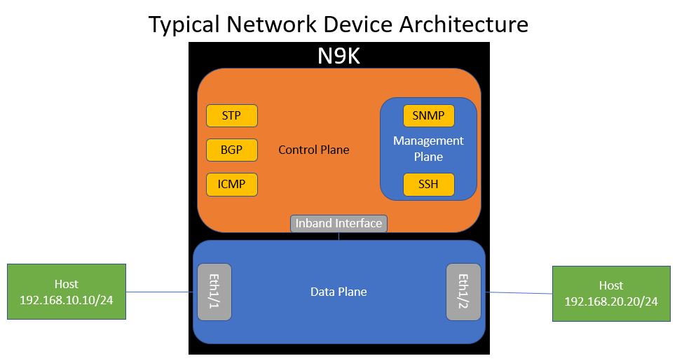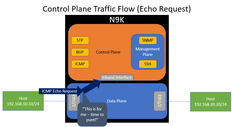 A practical example of control plane traffic in our topology is ICMP traffic destined to the network device itself. If the network device receives an ICMP Echo Request packet destined to an IP address of 192.168.10.1 (which the network device is assigned), the data plane will recognize that the network device itself owns this IP address and forward the packet to the control plane’s inband interface. This action is called a “punt”.