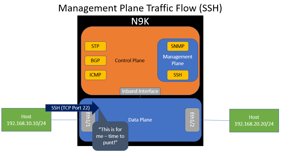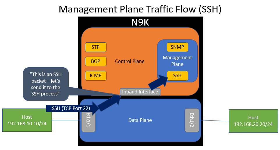 When the control plane receives this SSH packet through the inband interface, it will inspect it and “route” it to the SSH software process so that the SSH process can handle it accordingly.