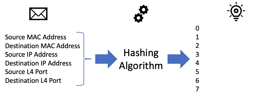 Next, you may want to know exactly how hashing works. As stated before, the exact hashing algorithm used by a switch is proprietary information. However, at a high level, the switch will do some quick math on the relevant headers of the packet (selected based upon the port-channel’s load-balancing algorithm) and the algorithm will spit out an integer number. Let’s say the number the algorithm spits out is between 0 and 7.