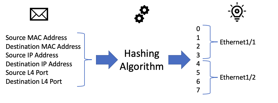 Internally, the network device will assign each physical interface in the port-channel or ECMP group a number. In our example, Ethernet1/1 may be internally assigned 0, 1, 2, and 3. Ethernet1/2 may be internally assigned 4, 5, 6, and 7.
