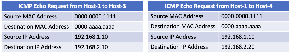 For a practical example of this concept, let’s two ICMP Echo Request packets - one sent from Host-1 to Host-3, and another sent from Host-1 to Host-4. If we were to capture these packets as they enter Switch-1, their headers would look like this.